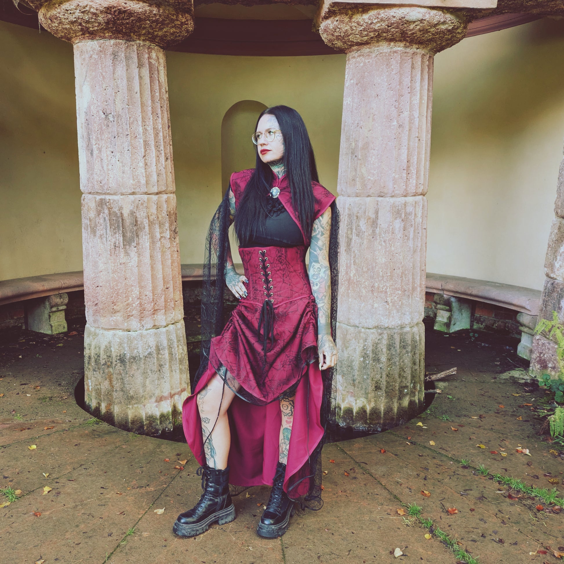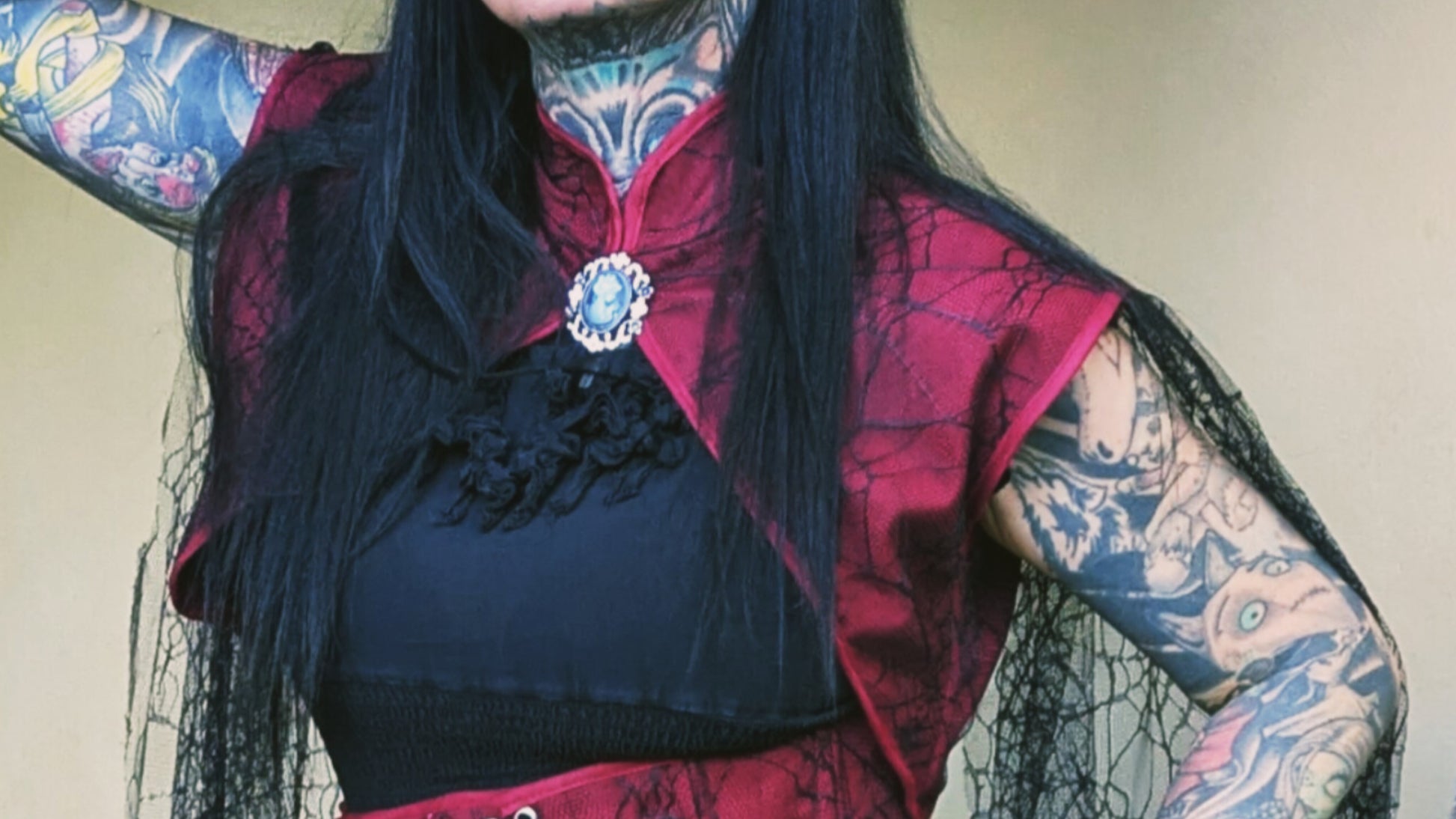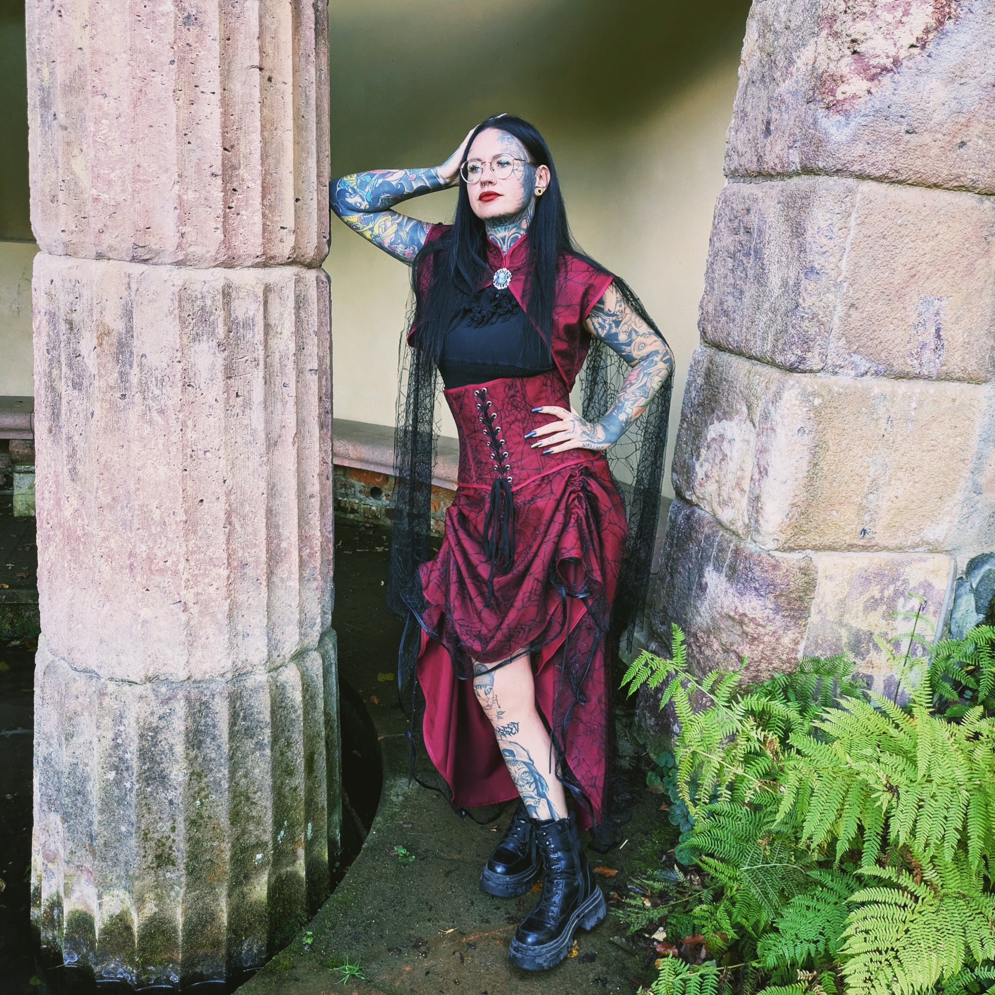 Bolero, Dunkelrot mit Spitze aus Spinnennetz-Optik.