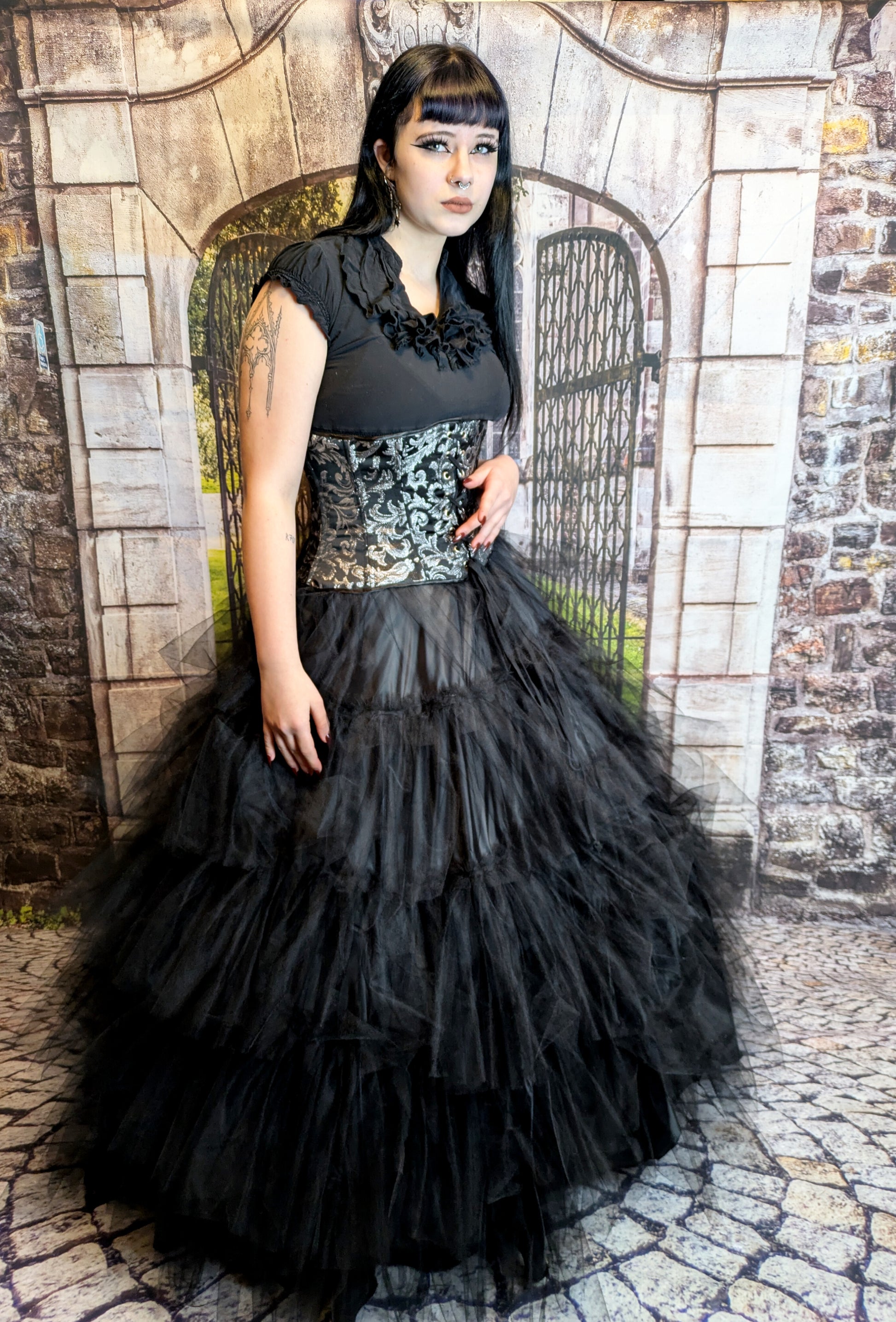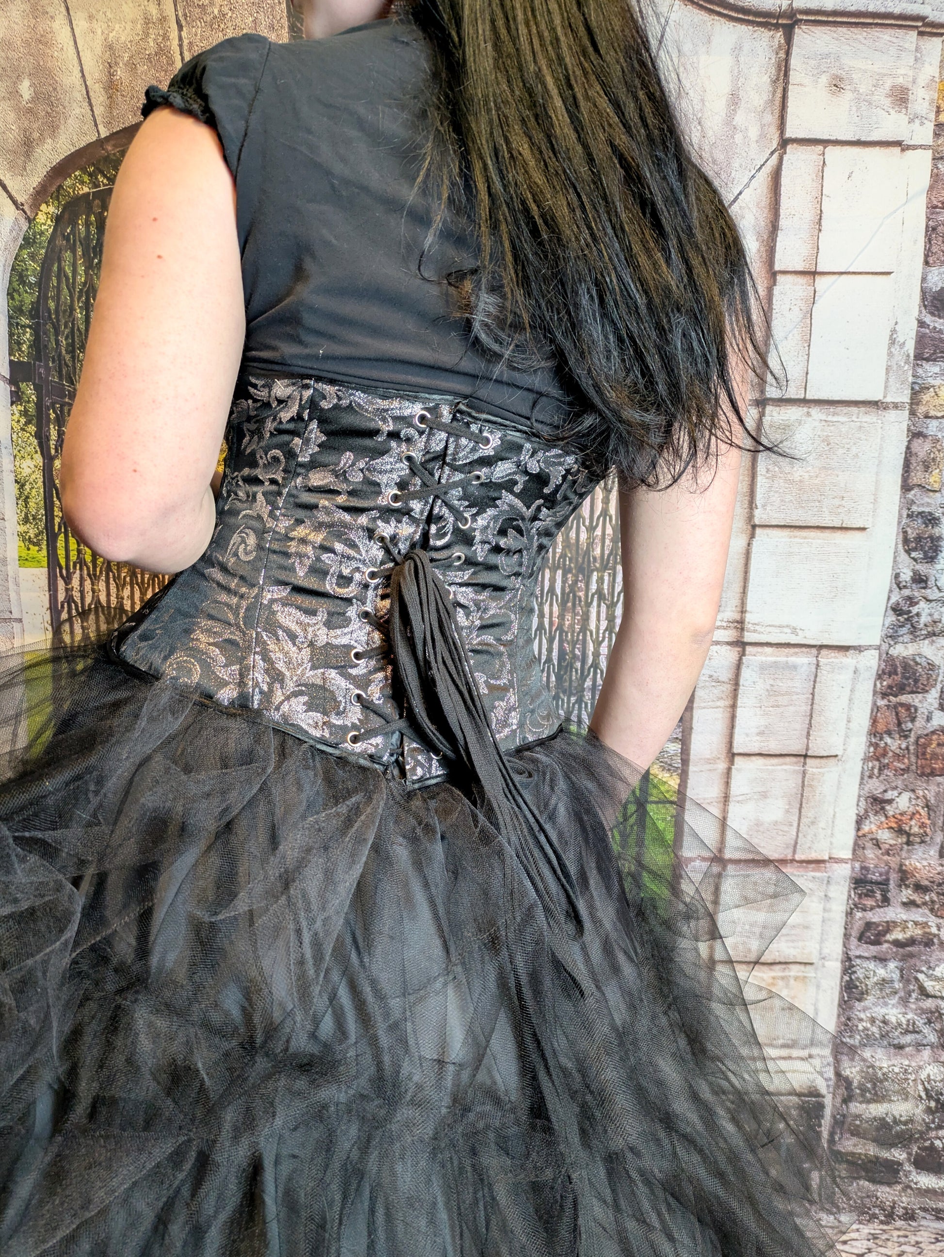 Unterbrustkorsett, schwarz mit silbernen Ornamenten